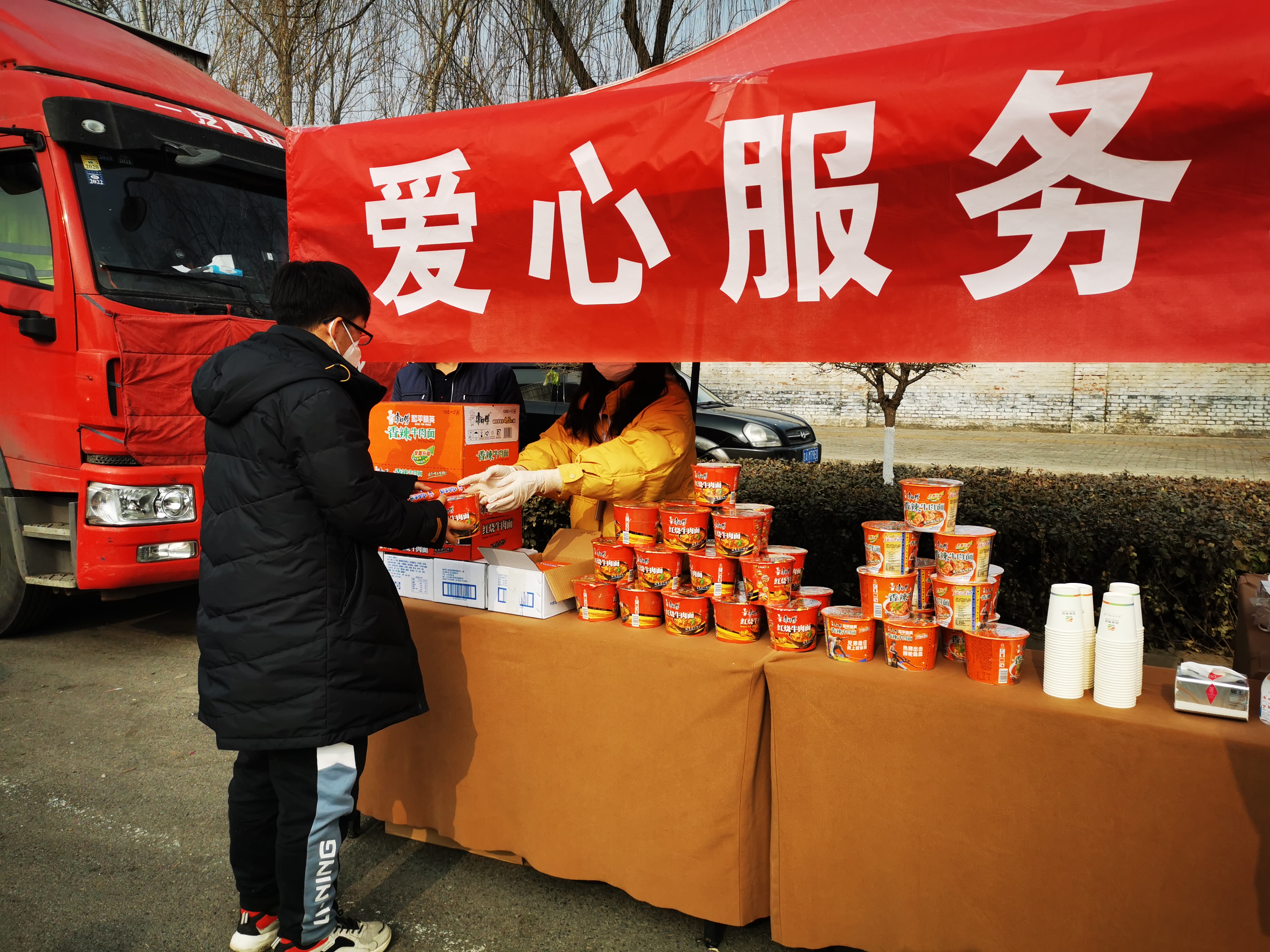“這不都要過年了,周圍好多餐飲店也關門了,我們吃飯也不方便,這不給我們免費的方便面,還有熱水,我在車上就把飯吃了,很貼心。”來自張家口的物流司機王強表示,“正好,吃口熱乎的,車也裝滿了,我下午就到張家口了。”